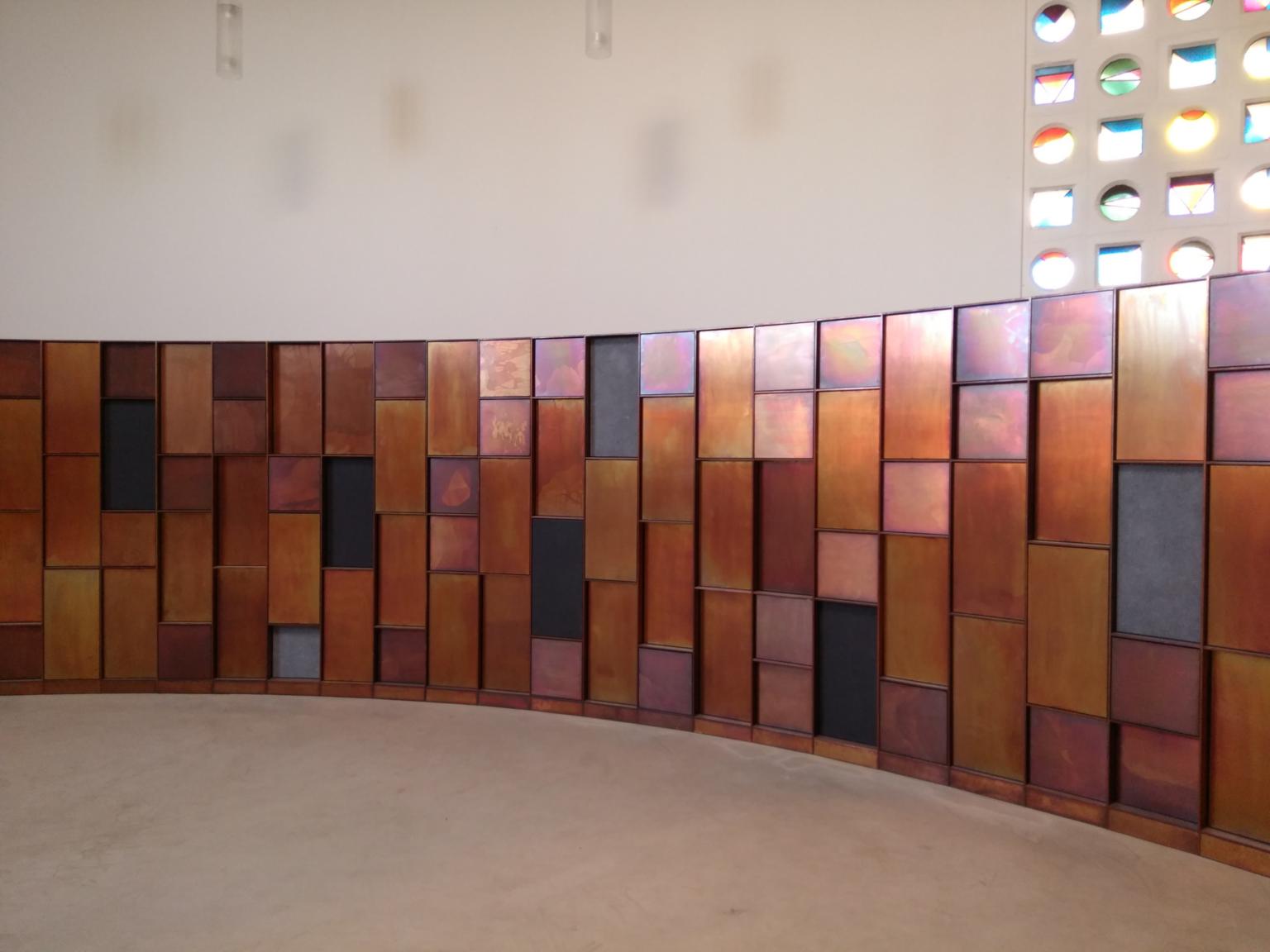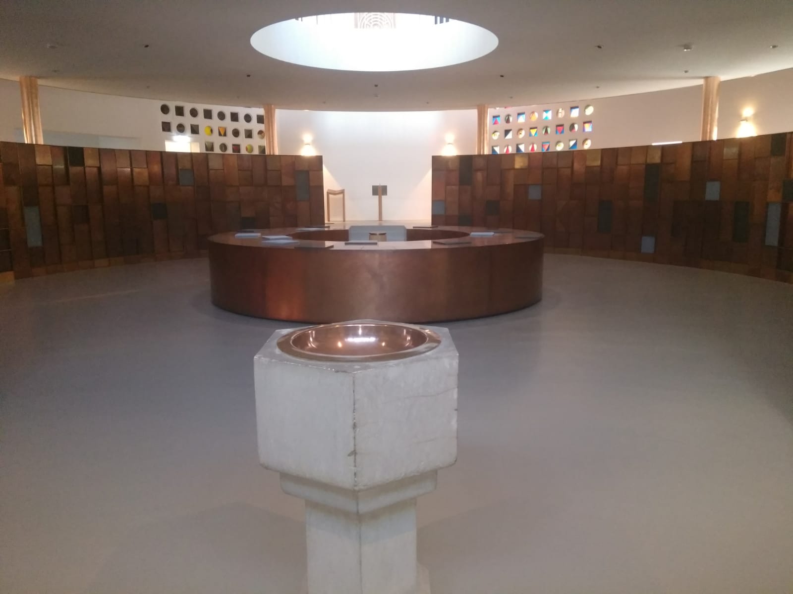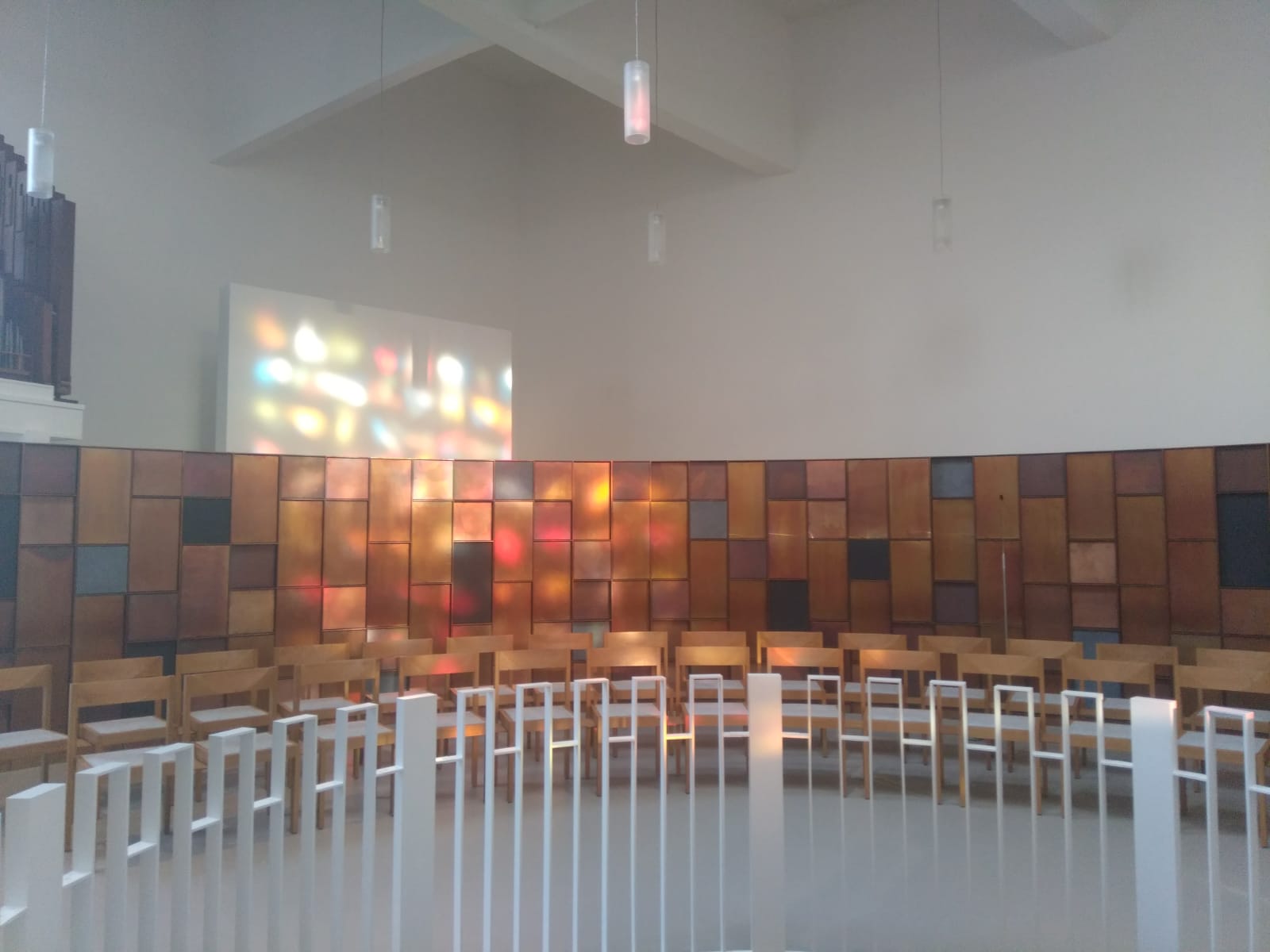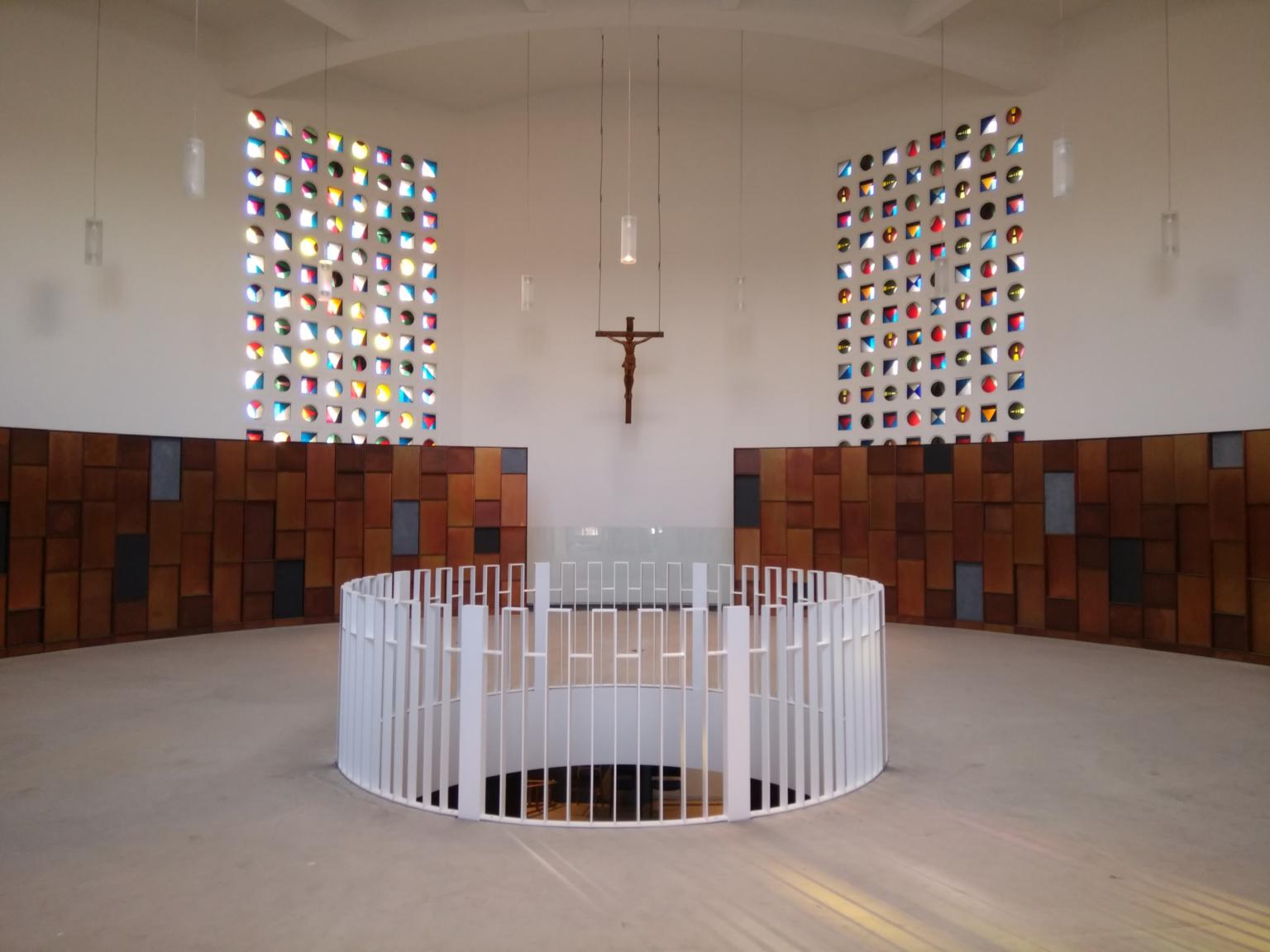 Einige Bänke laden bald Besucher ein. Der Kirchgarten ist ein Ort der Ruhe, es gibt keinen äußeren Zugang, nur einen inneren, so wie das Gedenken an die Verstorbenen sich er-innert. In der Ruhe kann der Seerosenteich wirken, dem Gedenken dienen. - Die Seerose wurde von den Architekten Paulssen und Schlimm als Symbol neuen Lebens gewählt, in jeder Ecke des quadratischen Seerosenteiches ist eine weiße Seerose gepflanzt, die mit ihren Blüten auf das neue Leben im Licht der Auferstehung hinweisen soll. Am Zugang des Teiches ist ein Zitat aus dem Buch Ijob gewählt worden.